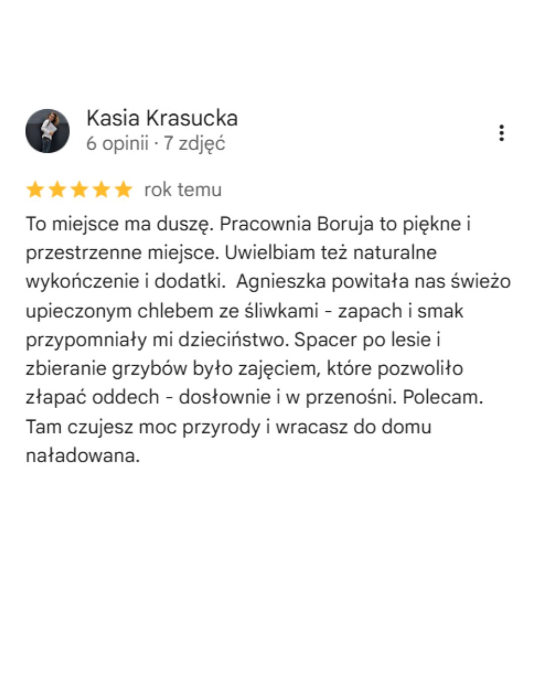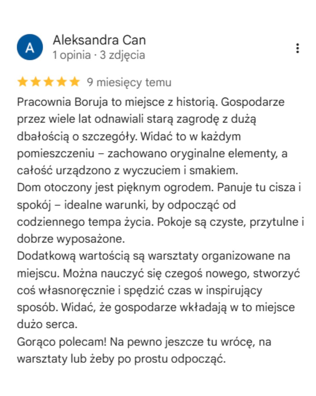 Możesz korzystać ze wspólnej kuchni, salonu z kominkiem i dużego ogrodu z wiatą i miejscem na ognisko. To idealne miejsce dla osób pragnących odpoczynku, kontaktu z naturą i wolniejszego rytmu dnia, w kameralnej i przyjaznej atmosferze Pracowni Boruja.